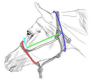 Mierzymy odcinek od miejsca, w którym będzie leżeć nachrapnik do końca ganasza, mniej więcej na szerokość dłoni poniżej nasady ucha. (zielony)